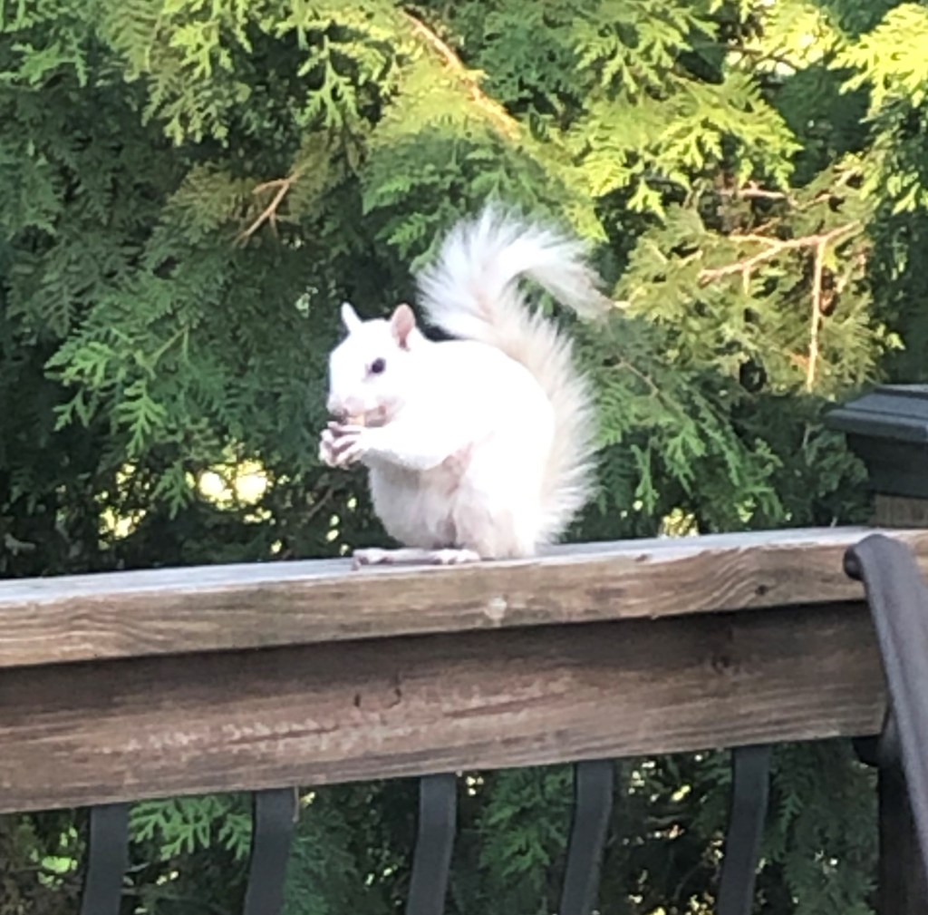 During the year 2020…something happened. Suddenly everyone spent more time at home…even work took place at home. At dining room tables, kitchen counters, rooms with windows. One day while working at the kitchen counter, we noticed a white squirrel in the tree. We fed her peanuts, she returned everyday for more, for over a year. She was cute, friendly, brave and rare – things we should all strive to be.