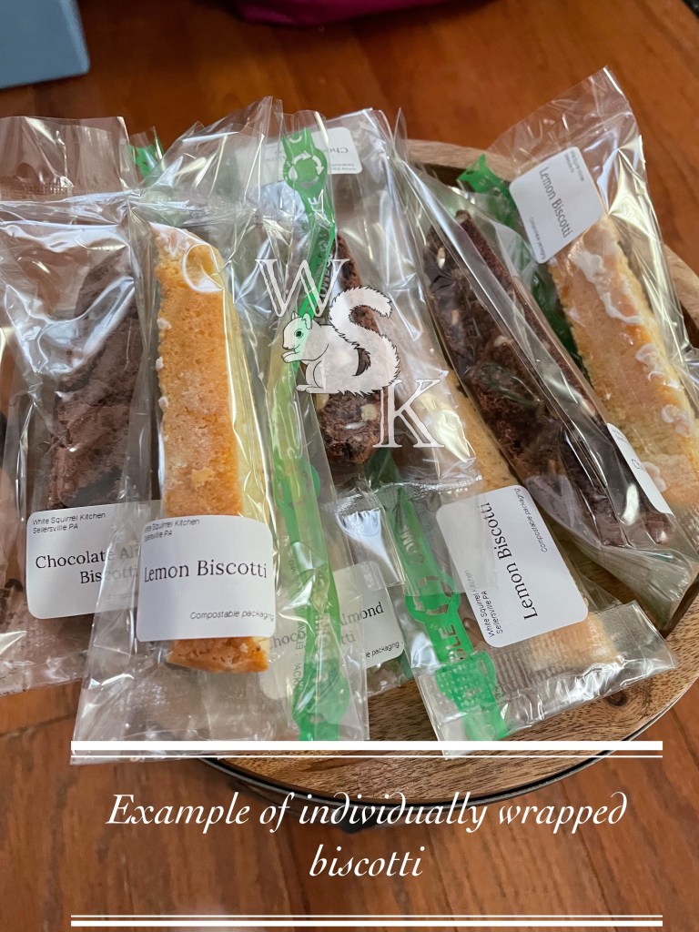 Available in 4oz, 8oz, and 16oz bags, or a 16 oz bag with individually wrapped pieces to help each biscotti stay fresh and clean