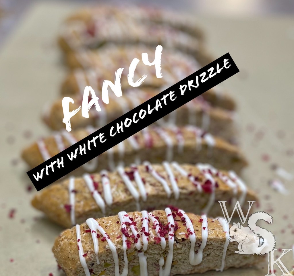 The choice of fussy Goldilocks, this holiday favorite biscotti has the “middle of the road” crunch factor of 5. Unsweetened cranberries, dehydrated in house, bring some tartness, and the cardamom sends it to the moon with flavor. We can even dress it up for company with a white chocolate drizzle sprinkled with extra cranberry (White Chocolate drizzle only available in 16oz size)